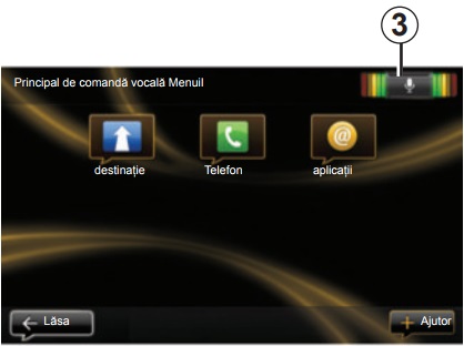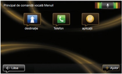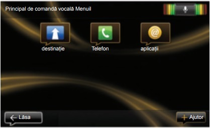 Puteţi să utilizaţi comanda vocală pentru a apela un contact din agenda telefonică, pentru a introduce o destinaţie, pentru a schimba postul de radio etc., fără să atingeţi ecranul. Apăsaţi scurt butonul de recunoaştere vocală 1 de pe volan sau 2 de pe maneta de pe comanda de direcţie a vehiculului. Ecranul tactil afişează meniul principal al controlului vocal.