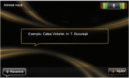 Notă: puteţi, de asemenea, să introduceţi o adresă sau o destinaţie recentă din meniul principal pentru comenzile vocale. Pentru aceasta apăsaţi pe butonul de comandă vocală, apoi spuneţi „Adresă” sau „Destinaţii recente” şi apoi pronunţaţi o adresă sau selectaţi destinaţia dorită.