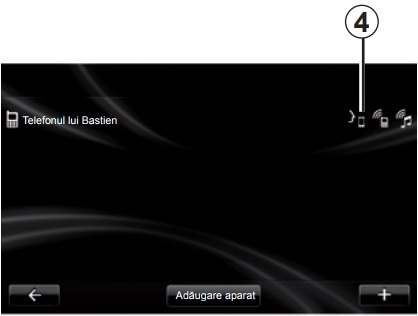 Notă: dacă funcţia de recunoaştere vocală a telefonului este compatibilă cu sistemul multimedia, se afişează pictograma 4 din meniul „gestionare dispozitive” (pentru mai multe informaţii, consultaţi secţiunile „Conectare, deconectare telefon” şi/sau „Împerechere, desperechere telefon”).